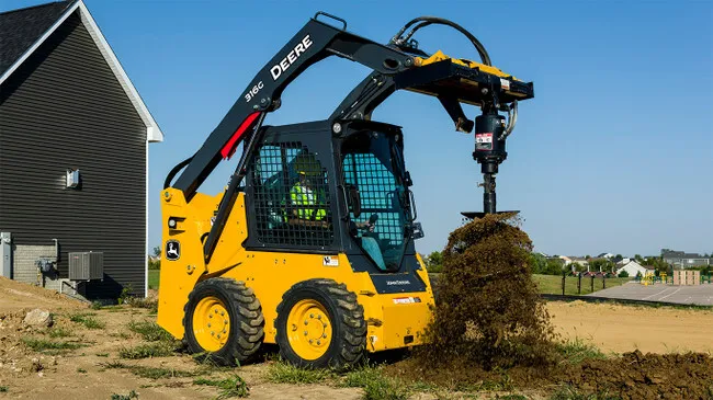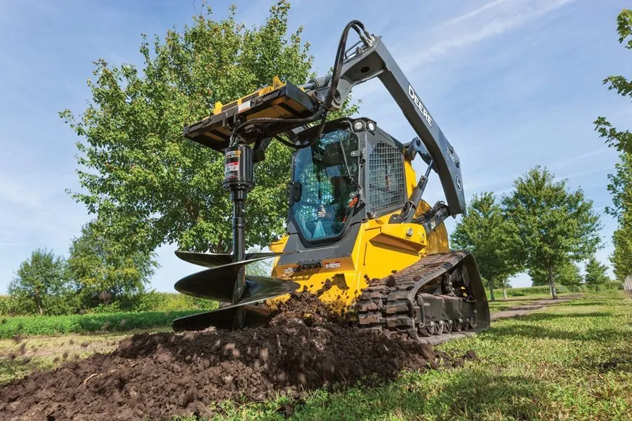 This auger is equipped with a universal skid steer loader mount allowing it to be attached to a wide variety of host machines.